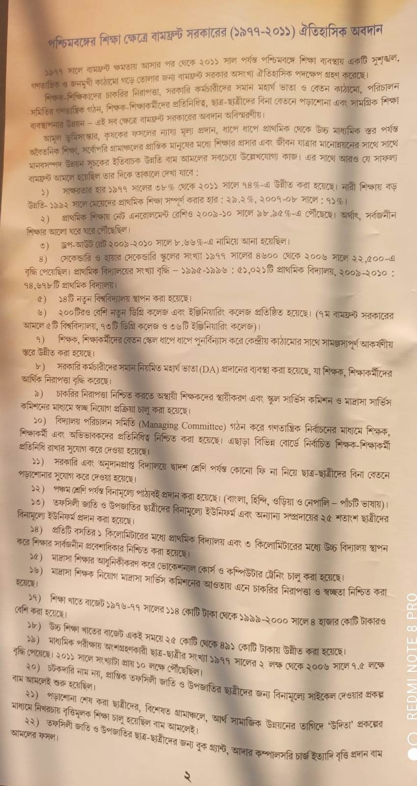 সংক্ষিপ্ত আকারে বামফ্রন্ট এর নির্বাচনী ইশতেহার ২০২৬--- 1] ২০২৬ বিধানসভা নির্বাচনে তৃণমূল এবং বিজেপি যখন ধর্মের ভিত্তিতে মানুষকে ভাগ করতে চাইছে। তখন রুটি, রুজির কথাকে সমানে রেখে নির্বাচনে লড়াই করছে বামফ্রন্ট। পত ১৫ বছরে রাজ্যে নতুন করে কোন কর্মসংস্থান তৈরি হয়নি। বন্ধ হয়েছে কারখানা। সরকারি পদে নিয়োগ নেই। শিক্ষক নিয়োগে হয়েছে দুর্নীতি। রাজ্য জুড়ে বাড়ছে অরাজকতা। এই সবের বিরুদ্ধে মানুষকে ঐক্যবদ্ধ হওয়ার আহ্বান জানিয়ে তৃণমূল এবং বিজেপিকে পরাস্ত করার ডাক দিয়েছে বামফ্রন্ট। 2] বামফ্রন্টের ইশ্তেহারে কর্মসংস্থান, শিক্ষা, স্বাস্থ্যের মতো একাধিক গুরুত্বপূর্ণ বিষয় উল্লেখ করা হয়েছে। প্রতিটা পরিবারে অন্তত একটি স্থায়ী কাজের কথা বলা হয়েছে ইশ্তেহারে। পাঁচ বছরে ৪০ লক্ষ স্থায়ী কর্মসংস্থান, ২৫ লক্ষ শিল্প ও লজিস্টিক পরিষেবায় কাজ, ২০ লক্ষ গ্রামীণ কর্মসংস্থান, ১৫ লক্ষ প্রযুক্তিভিত্তিক চাকরির কথা বলা হয়েছে ইশ্তেহারে।
