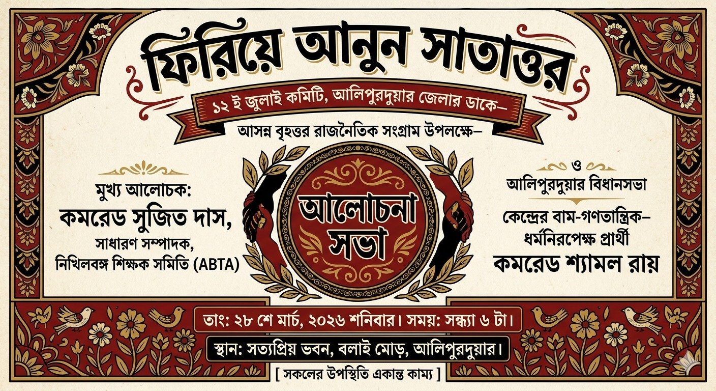 জটেশ্বর পার্টি অফিস প্রাঙ্গণ থেকে মিছিল শুরু হয়। চারিদিকে লাল ঝাণ্ডার ভিড় আর স্লোগানে মুখরিত হয়ে ওঠে এলাকা। মিছিলটি গোটা জটেশ্বর বাজার ও সংলগ্ন এলাকাগুলি পরিক্রমণ করে। প্রচার চলাকালীন প্রার্থী কমল কিশোর রায় বাজারের ব্যবসায়ী, পথচারী এবং সাধারণ ক্রেতাদের সঙ্গে সরাসরি কথা বলেন ও তাঁদের আশীর্বাদ প্রার্থনা করেন। মানুষের অভাব-অভিযোগের কথা শুনে আগামী দিনে পরিবর্তনের লড়াইয়ে সামিল হওয়ার আহ্বান জানান তিনি। এদিনের এই কর্মসূচিতে প্রার্থীর সঙ্গে পা মেলান বামফ্রন্টের জেলা ও স্থানীয় স্তরের একঝাঁক নেতৃত্ব। উপস্থিত ছিলেন জেলা কমিটির সম্পাদক মন্ডলীর সদস্য নেপাল গোপ, জেলা কমিটির সদস্য দীনবন্ধু বর্মন ও সুনীল রায়। এছাড়াও স্থানীয় বাম নেতৃত্ব এবং যুব-ছাত্র ফ্রন্টের কর্মীরা উদ্দীপনার সাথে মিছিলে অংশ নেন।