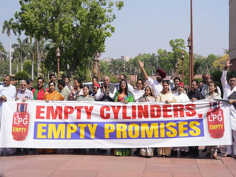 সংসদ ভবন চত্বরে বিরোধী সাংসদদের হাতে প্ল্যাকার্ডে লেখা ছিল: ‘এলপিজি গায়েব’, ‘ এম্পটি সিলিন্ডার, এম্পটি প্রমিস ‘।