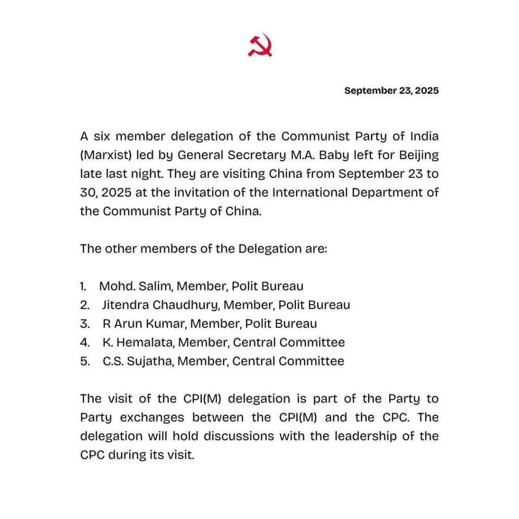 NEW DELHI: (Sep 23) A six-member delegation of the CPI(M), led by general secretary MA Baby, is visiting China for a 7-day trip at the invitation of the International Department of the Communist Party of China (CPC), the Left party said.