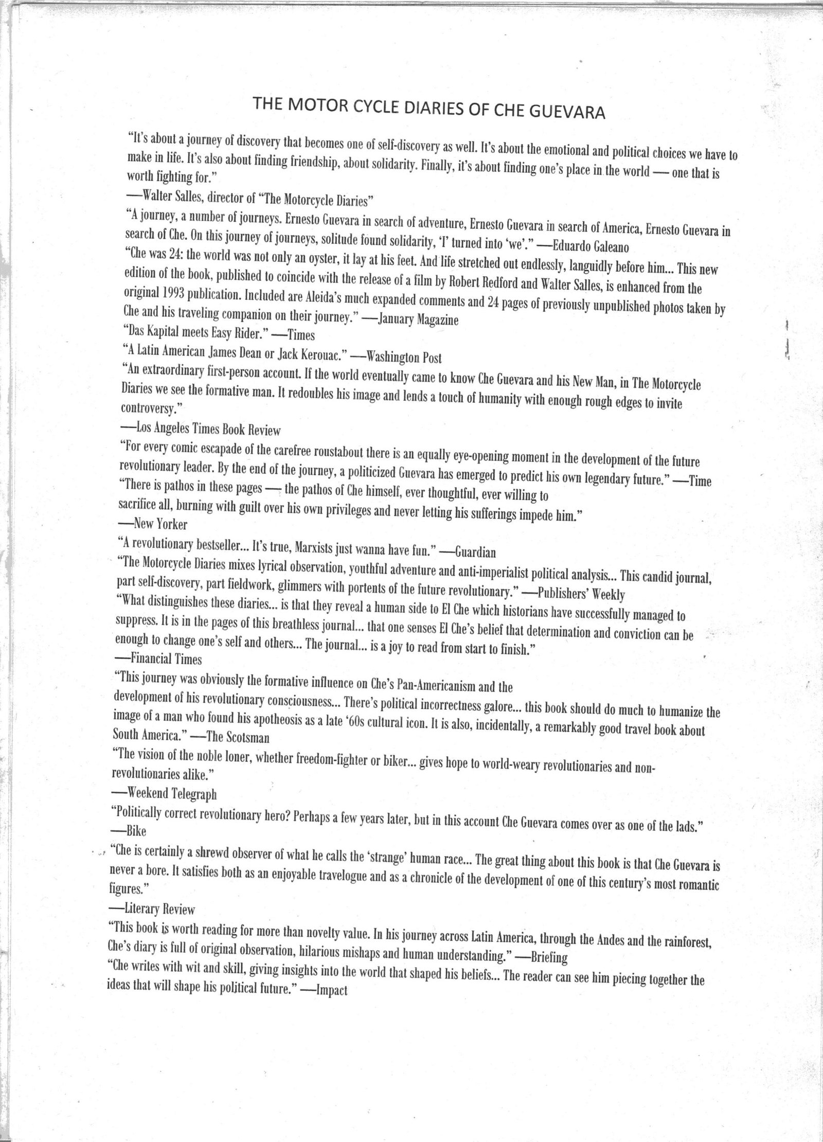 development of his revolutionary consciousness… There’s political incorrectness galore… this book should do much to humanize the image of a man who found his apotheosis as a late ’60s cultural icon. It is also, incidentally, a remarkably good travel book about South America.” The Scotsman